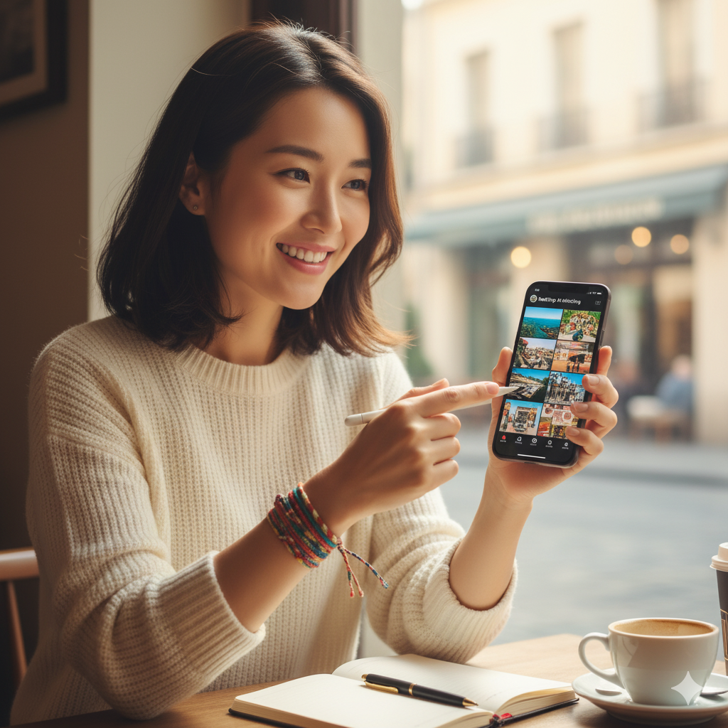 作成したリールをワンタップでSNSに共有。友人と旅の思い出を簡単にシェア。